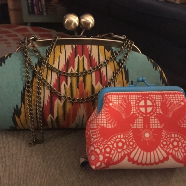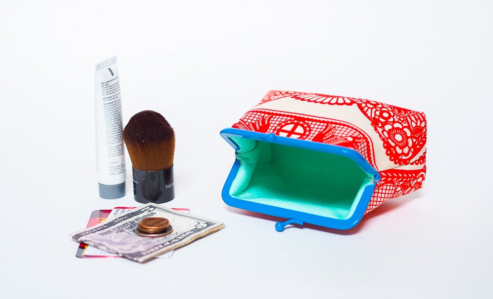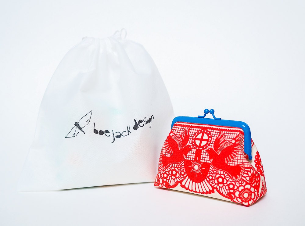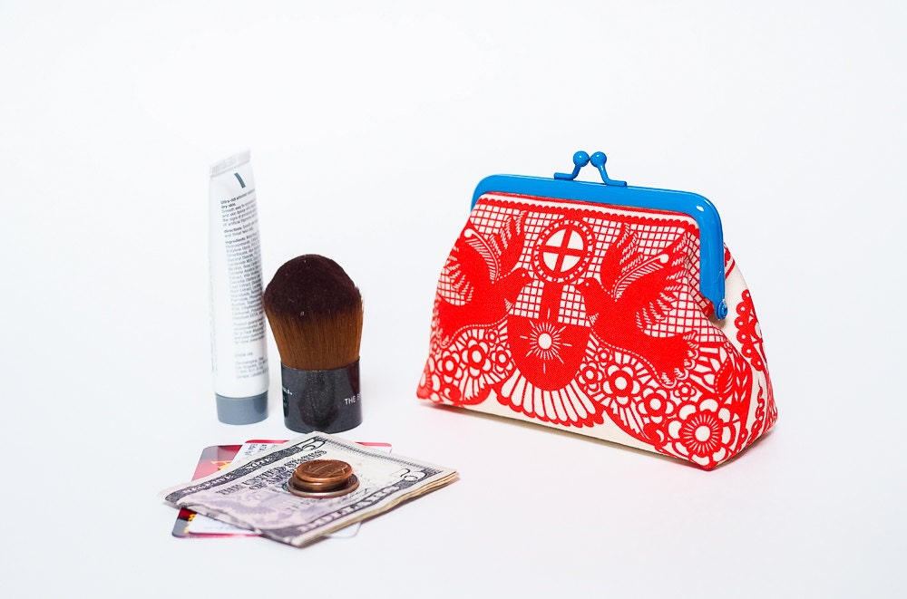 This little red coin purse with blue kiss lock metal frame keeps everything safe inside your handbag. A perfect way to stock your credit cards, lots of coins, earbuds and jewelry...