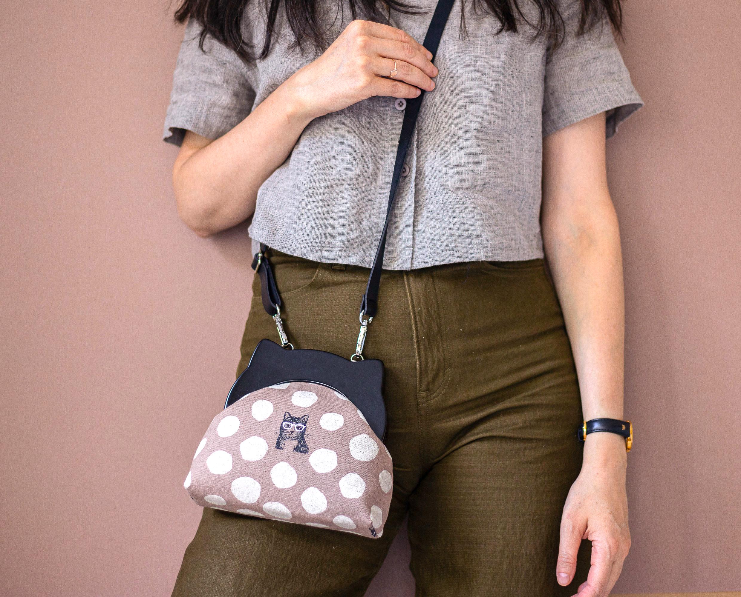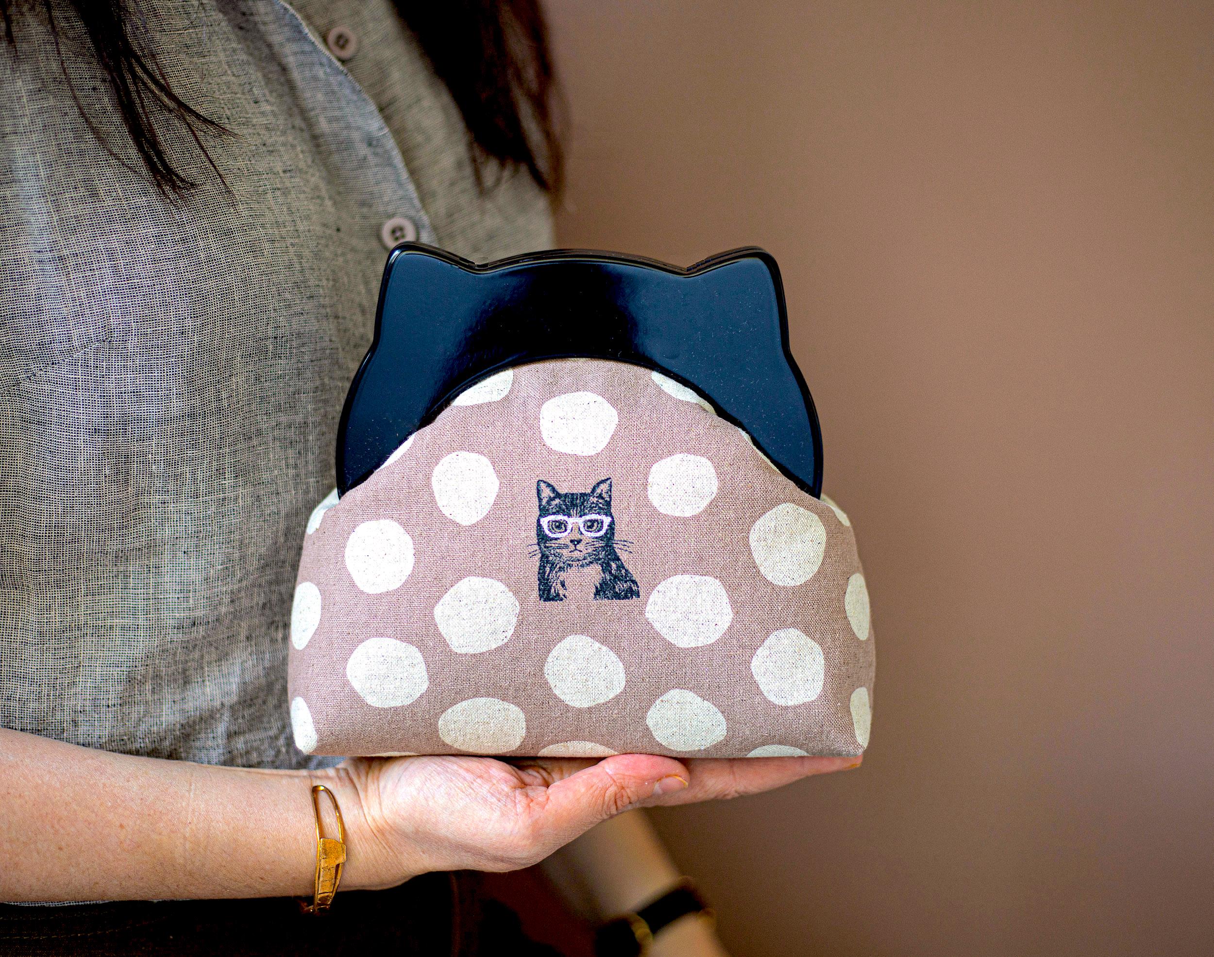 + Cute cat face with glasses on one side and without glasses on the other side of the purse.