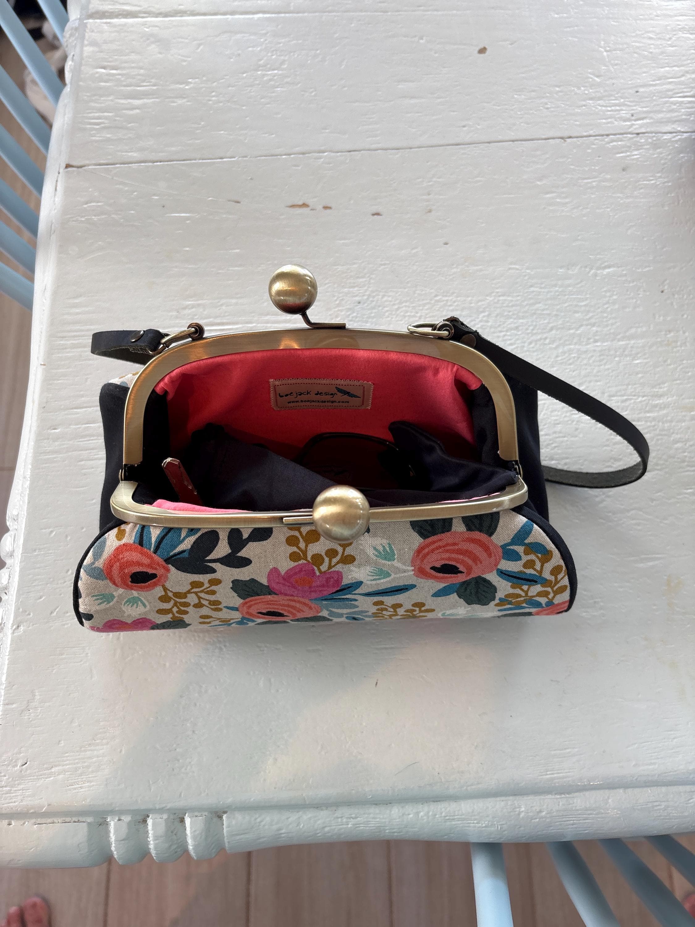 This kiss lock clutch purse is stunning and timeless with its beautiful floral print fabric designed by famous Rifle Paper Co. Its size is more than enough to hold all your essential belongings such as keys, phone, make up, and even a small bottle of water.